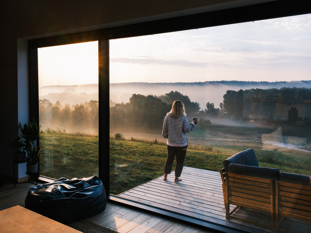 Dom jest komfortowo wyposażony. Wnętrze to nowoczesny minimalizm. Mamy wielkie okna do podziwiania przyrody, dwie sypialnie i salon z ogromnymi oknami.