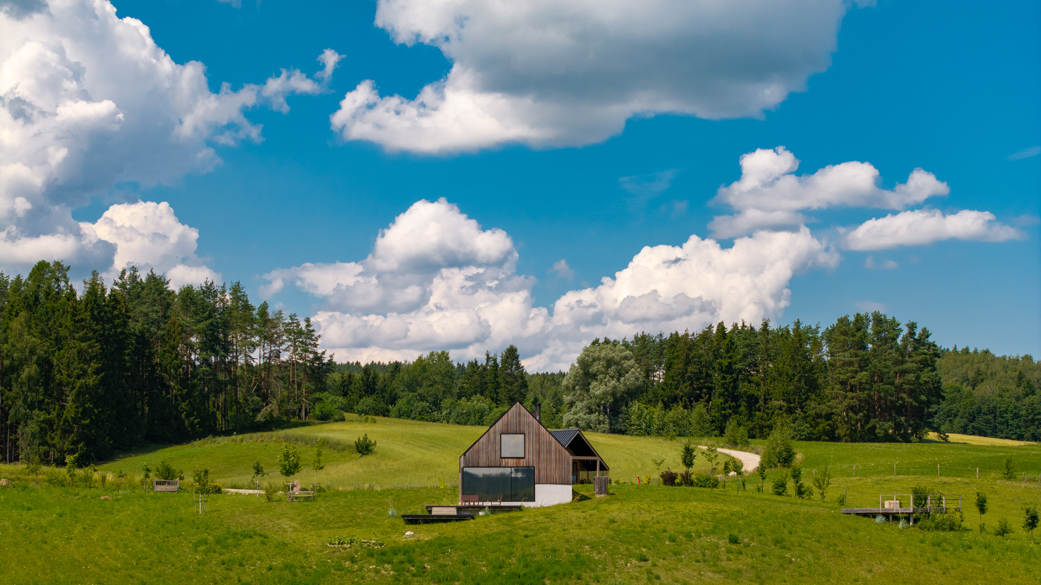 Projektując „Pobądź z nami”, zależało nam na połączeniu zamiłowania do nowoczesnego designu z szacunkiem dla unikalnego charakteru Suwalszczyzny. Bryła domu nawiązuje do tradycyjnych budynków gospodarczych, z kamiennymi fundamentami i elewacją z naturalnie starzejącego się modrzewiu. Dom wpasowany jest we wzgórze, na którym stoi, a aby zachować naturalne ukształtowanie terenu, do wejścia prowadzi 10-metrowy pomost, zawieszony nad ziemią. Dzięki temu dom wtapia się w skarpę, tworząc harmonijną całość z otoczeniem a przy jego budowie nie zmieniono rzeźby krajobrazu.